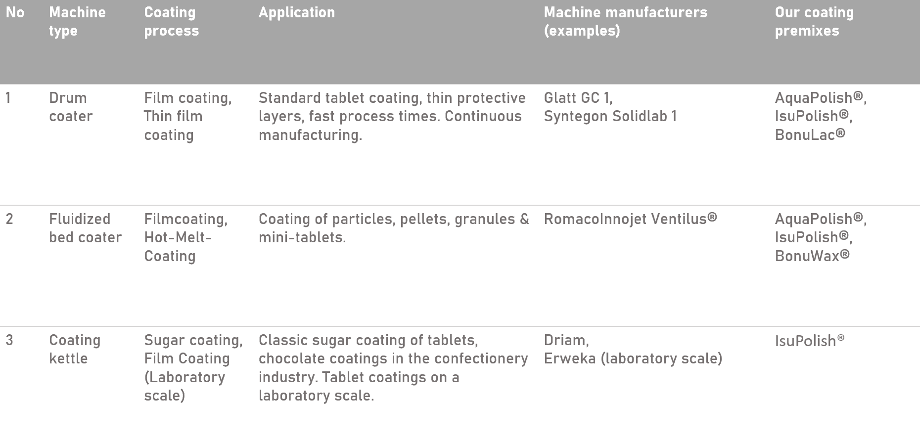 Film coating is a process in which tablets are coated with a thin, even layer of one or more polymers. This layer, also known as a film, can fulfill different functions and improve the properties of the tablet. Compared to coating, the process times for film coating are significantly faster.