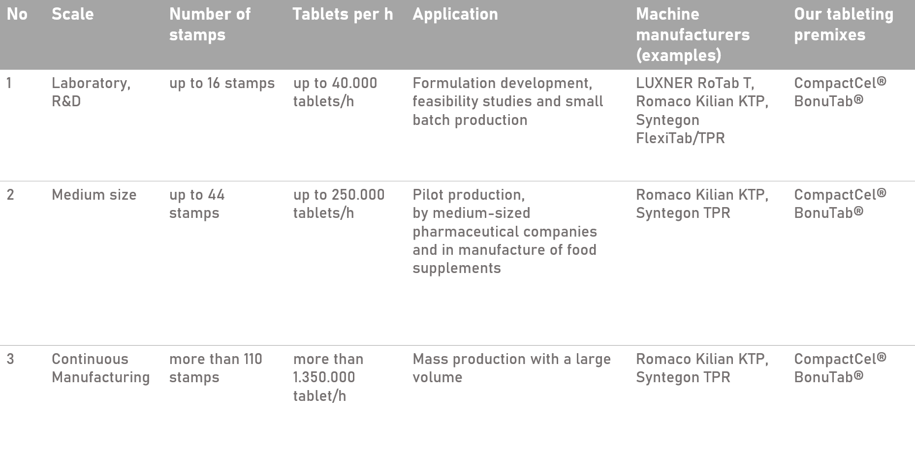 The powder is produced in a machine with several rotating stations. Machines for large-scale production can be equipped with over 100 punches and can press well over 1 million tablets per hour. Ideal for mass production due to high production speed.